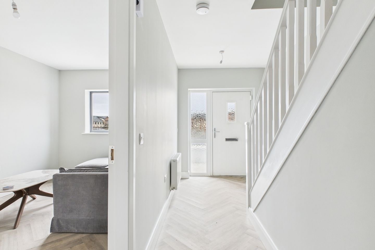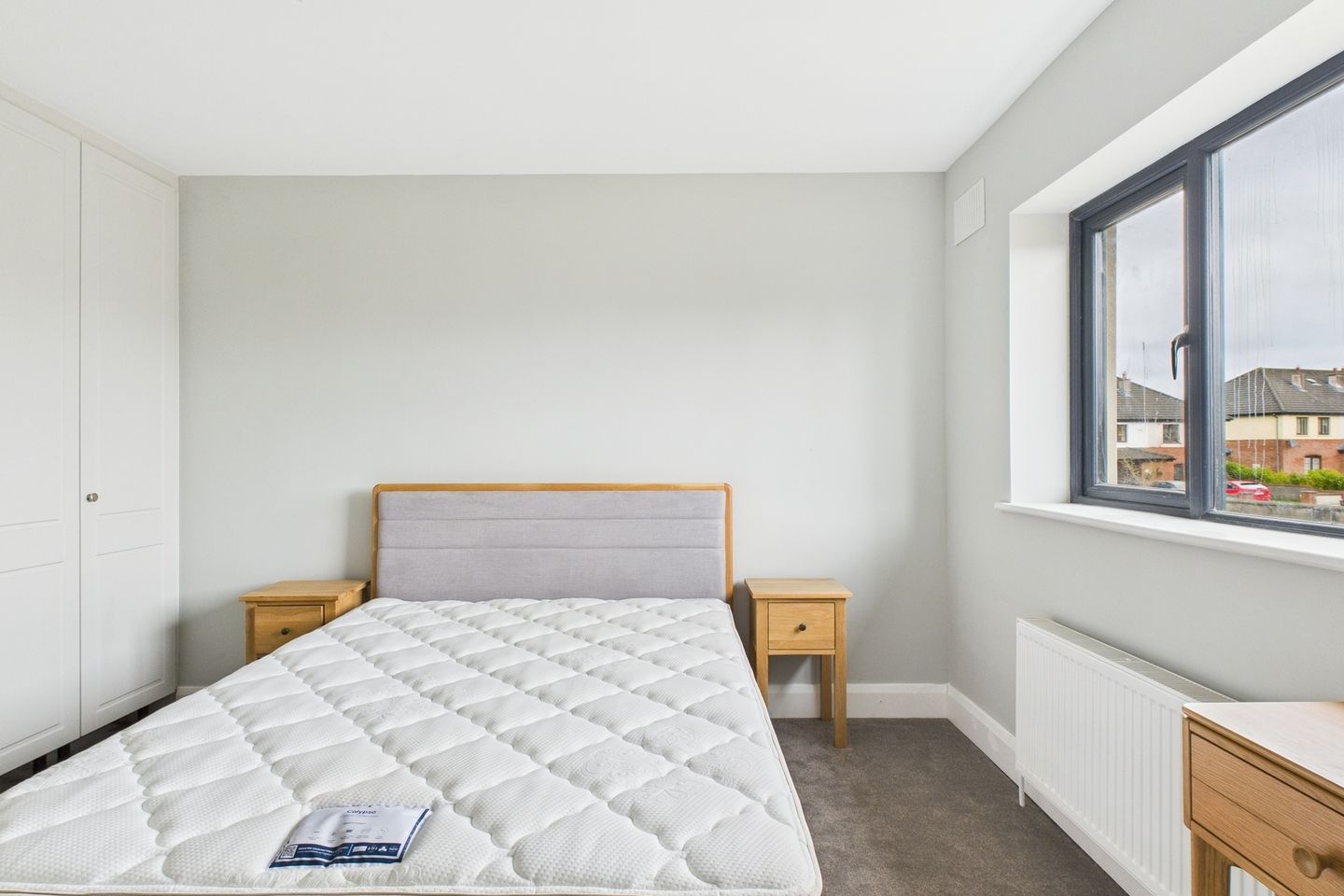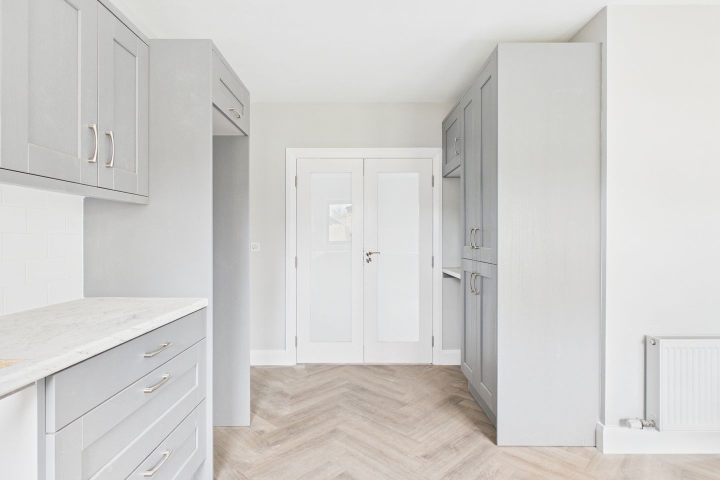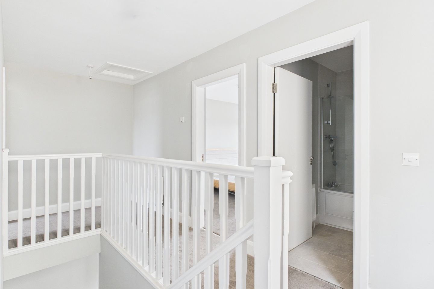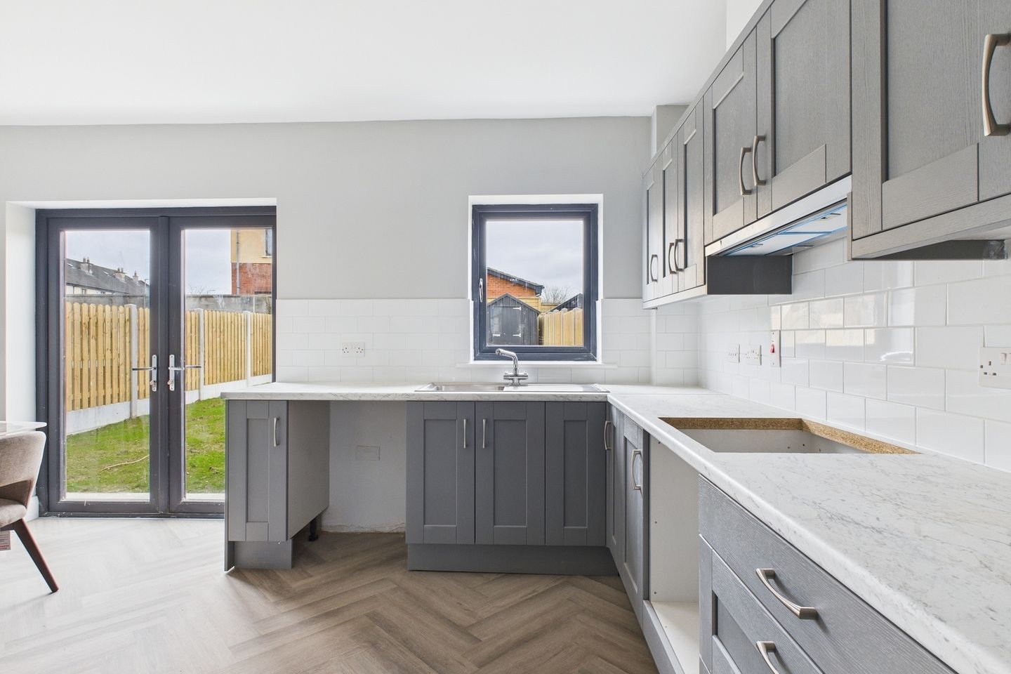 Painted in light grey with a staircase painted white with a timber handrail. Superb contemporary shaker-style painted kitchen Wardrobes in two bedrooms included. Bathroom floors and showers are tiled to wet area. Seeded garden with boundary wall/fence to rear gardens.